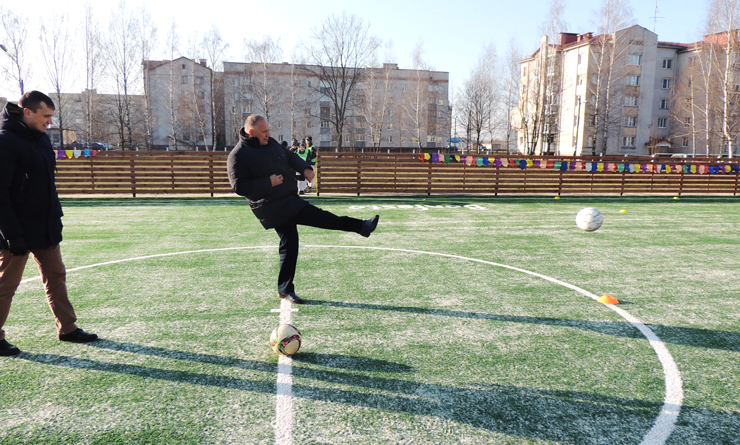 В торжественной церемонии открытия спортивной площадки приняли участие главный специалист управления по образованию, спорту и туризму Пуховичского райисполкома Денис Александрович Рыжаков, главный специалист управления по образованию, спорту и туризму Пуховичского райисполкома Жанна Владимировна Данилович, заместитель директора по развитию и маркетингу ОАО «Туровский молочный комбинат» Наталья Юрьевна Черник, директор Департамента обеспечения спортивных мероприятий Ассоциации «Белорусская федерация футбола» Иван Иванович Горовец. Почетные гости церемонии символично перерезали ленту и отправили первый гол в ворота на новой спортивной площадке под бурные аплодисменты юных спортсменов.